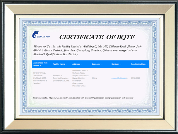 The company originated in Bluetooth wireless technology services and now operates laboratories specialising in EMC electromagnetic compatibility, RF radio frequency, Bluetooth BQB, safety standards, IoT performance, audio performance, and reliability testing. It is the first authorised laboratory in South China to achieve Bluetooth 5 testing capability. BlueAsia's Wuhan laboratory serves the Central China region. Our laboratories comply with the ISO 17025:2017 system and hold the following accreditations: American A2LA: CN1252; Canadian CAB: CN0028; Japanese C&S accreditation; and Bluetooth SIG BQTF certification.